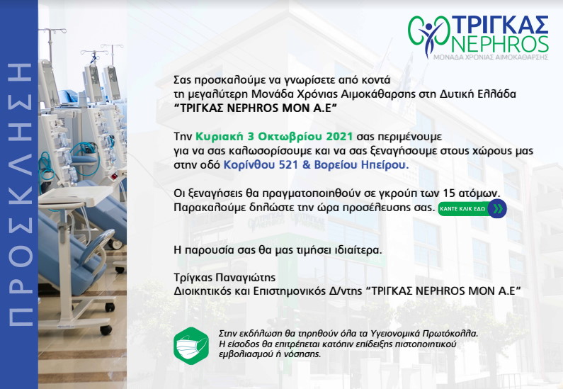 Τη σημαντική αυτή συμμετοχή υποστήριξε έμπρακτα ως αποκλειστικός χορηγός η μεγαλύτερη Μ.Χ.Α. στη Δυτική Ελλάδα "ΤΡΙΓΚΑΣ NEPHROS" και ο ιατρός νεφρολόγος και ιδιοκτήτης της "ΤΡΙΓΚΑΣ NEPHROS" κ. Παναγιώτης Τρίγκας